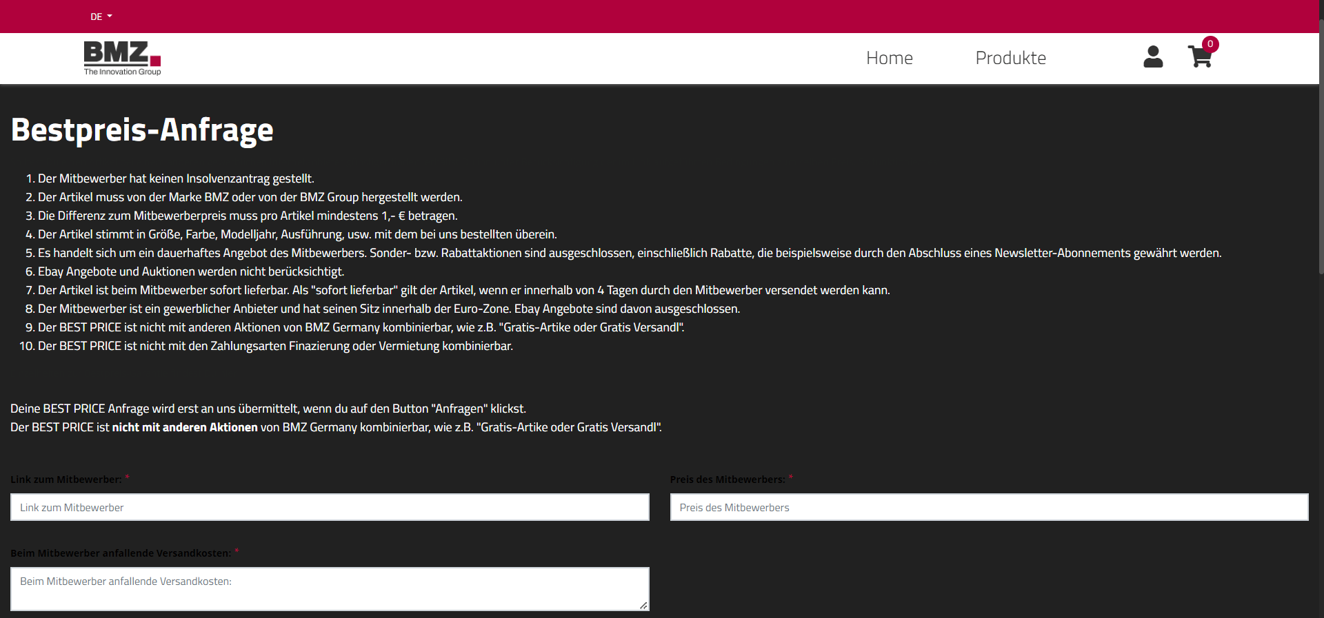 Articles for which you can make a BEST PRICE request are products of the BMZ brand or are manufactured by the BMZ Group.